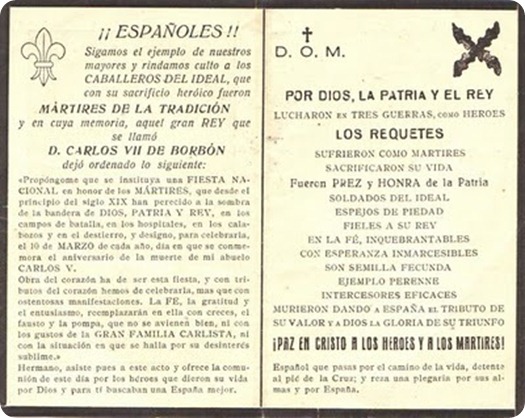 Dicho ello, hoy tendría lugar, el “Día de los Mártires de la Tradición”, una jornada en honor de los mártires que desde el principio del siglo XIX han perecido a la sombra de la bandera de Dios, Patria y Rey en los campos de batalla y en el destierro, en los calabozos y en los hospitales.